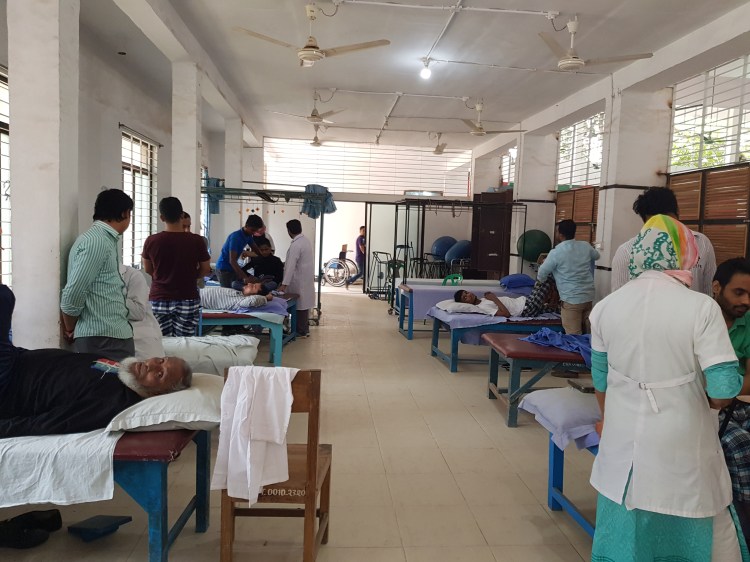 We grabbed some breaktime food again like yesterday and though I was this time prepared, Chandenee bought it for me anyway. I then went and mooched around the rehab room, eventually zoning in on a female PT working alone with a patient. Of course, 20 minutes later, we had a crowd. One man who I remembered being very competitive during sports yesterday wanted to teach me Bangla if I taught him English because he wanted to pass his English exam and go to England. So everyone was laughing and joking whilst I tried to speak Bangla and it almost seemed like the patient was forgotten about. I tried to revert conversation back to PT related stuff but it would just sling shot back to language.